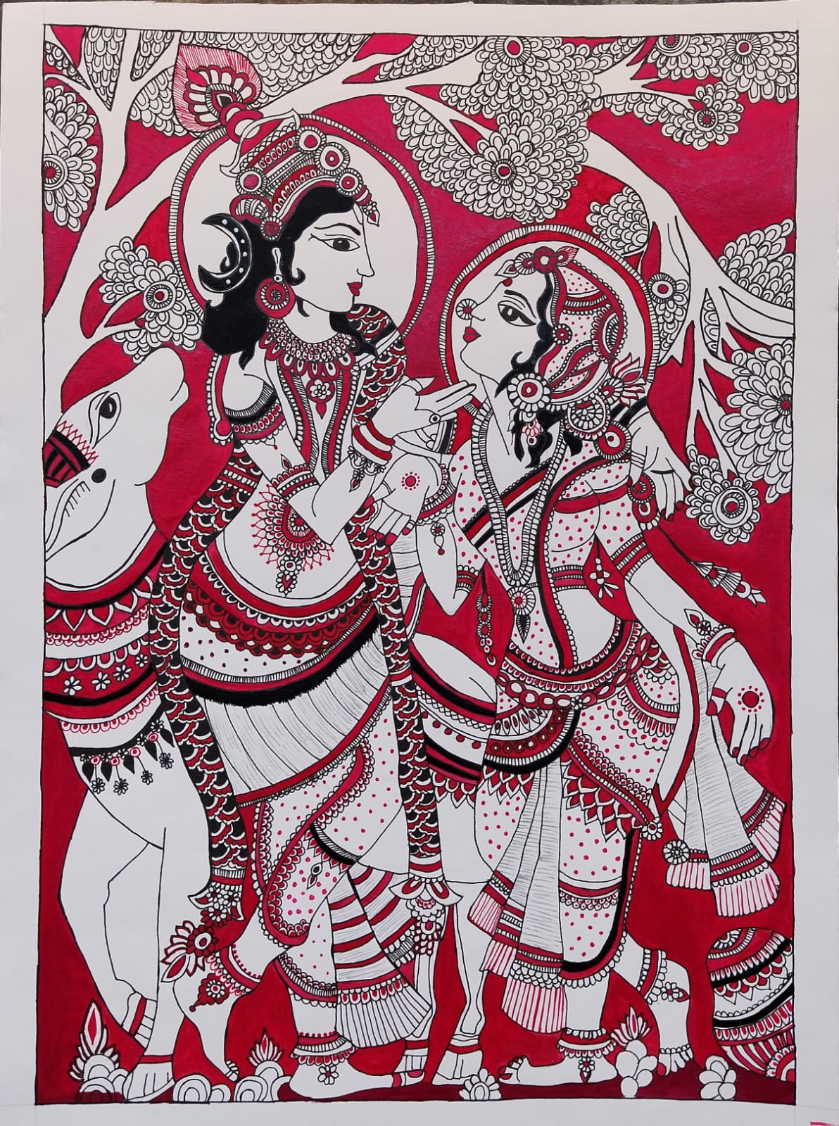Rooted in the ancient art form of Madhubani Painting from Bihar, India, this masterpiece beautifully portrays Radha and Krishna immersed in divine dance, symbolizing eternal love, joy, and devotion.