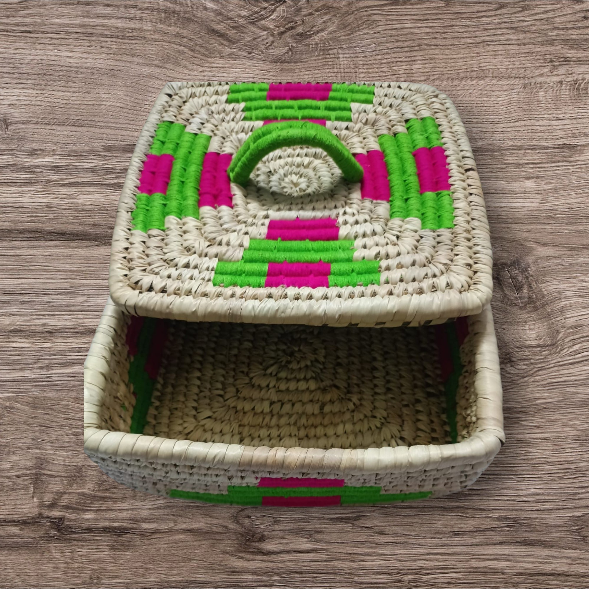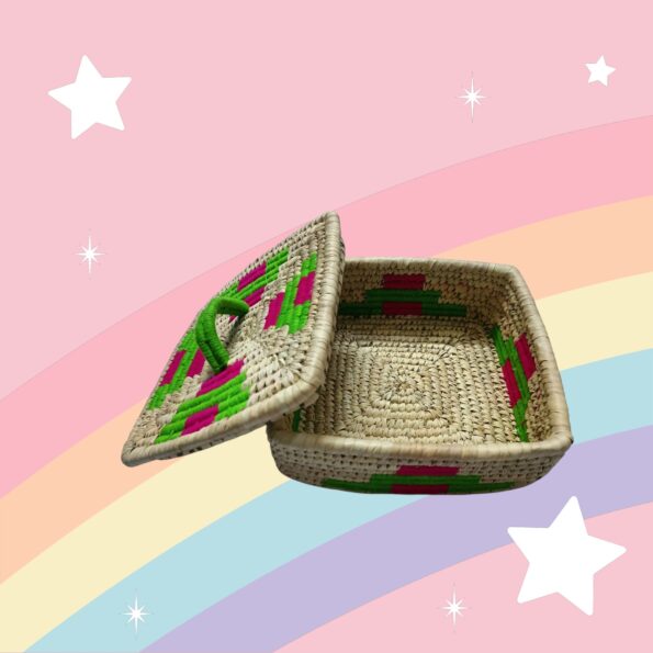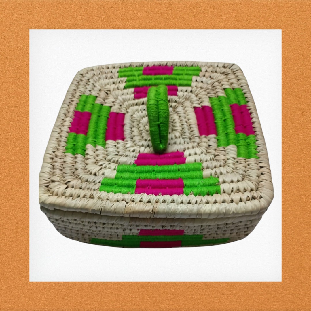 Handwoven from eco-friendly Sabai grass, this charming square basket features intricate weaving, durable construction, and vibrant accents in teal green and magenta pink. Its sturdy lid and handle make it a versatile choice for gift hampers, home storage, or decorative displays.
